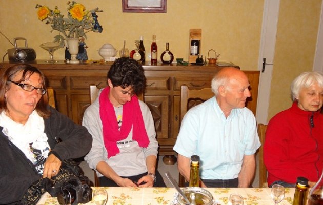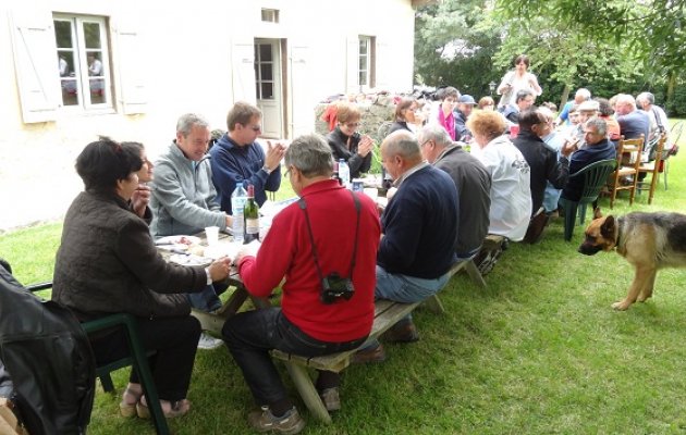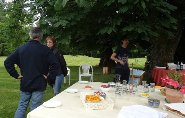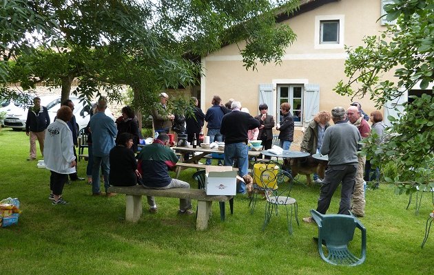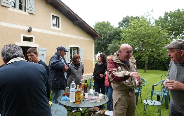 Comme savent le faire si bien les Gascons, Hervé et Anne Oulé nous accueillent très chaleureusement dans leur superbe gite. Nous sommes donc une trentaine à prendre l’apéro dans un parc verdoyant, devant le gite. Anne nous offre du Floc bien frais, un régal. Le pique-nique savamment préparé par Claudine et Jean-Marie est le bienvenu. Au menu : charcuterie, œufs durs, salade composée, rôti froid, chips, fromage, et flamby (Crème caramel bien sûr !). Anne nous fera gouter son délicieux pâté fait « maison ». Le tout accompagné de vin rouge et rosé, bu avec modération comme il se doit.